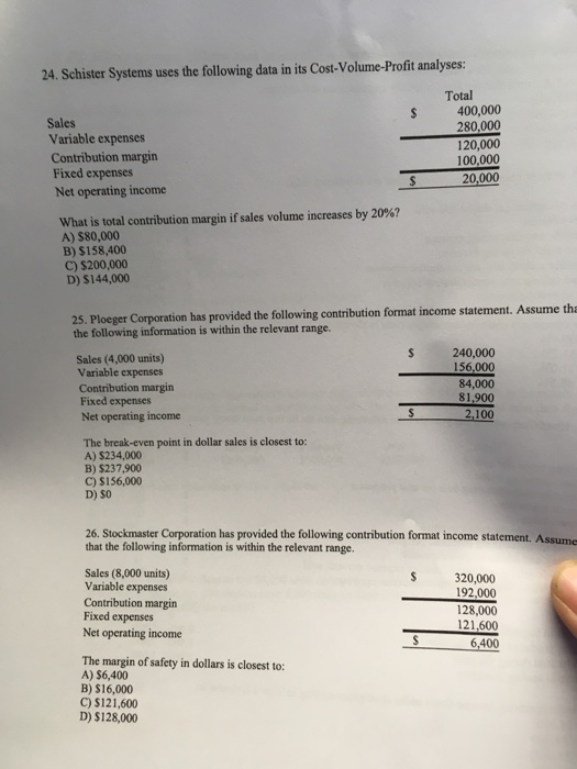 Total Sales S 355000 Variable expenses 213000 Contribution margin 142000 Fixed expenses 111000 Net operating income S 31000 What is total contribution margin if sales. Multiple Choice 42000 O 180000 O 234000 O 78000. Schister Systems uses the following data in its Cost-Volume-Profit analyses.